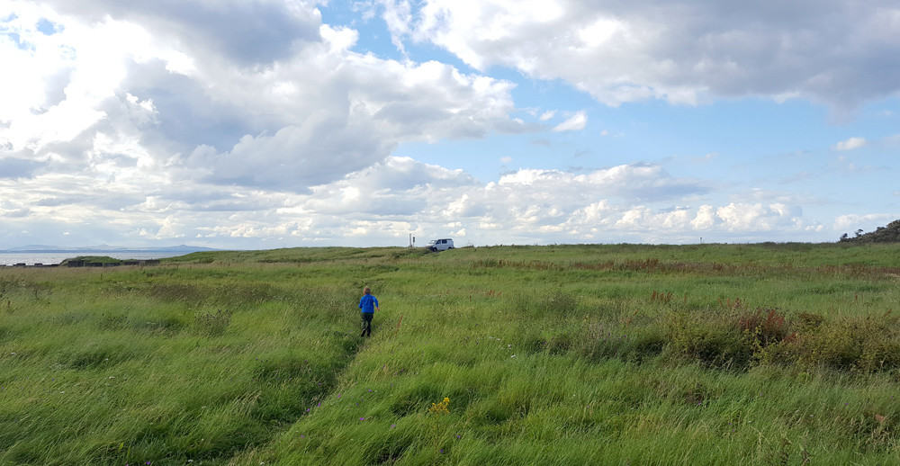Um einen schönen Platz zu finden, bin ich die kleinen Straßen direkt an der Küste entlang gefahren. Und siehe da! nach nicht allzu langer Zeit tauchte bei Longniddry ein toller Parkplatz auf. Als erster gesehen hat ihn übrigens Sohnemann. Langsam wird er zum Profi 😀